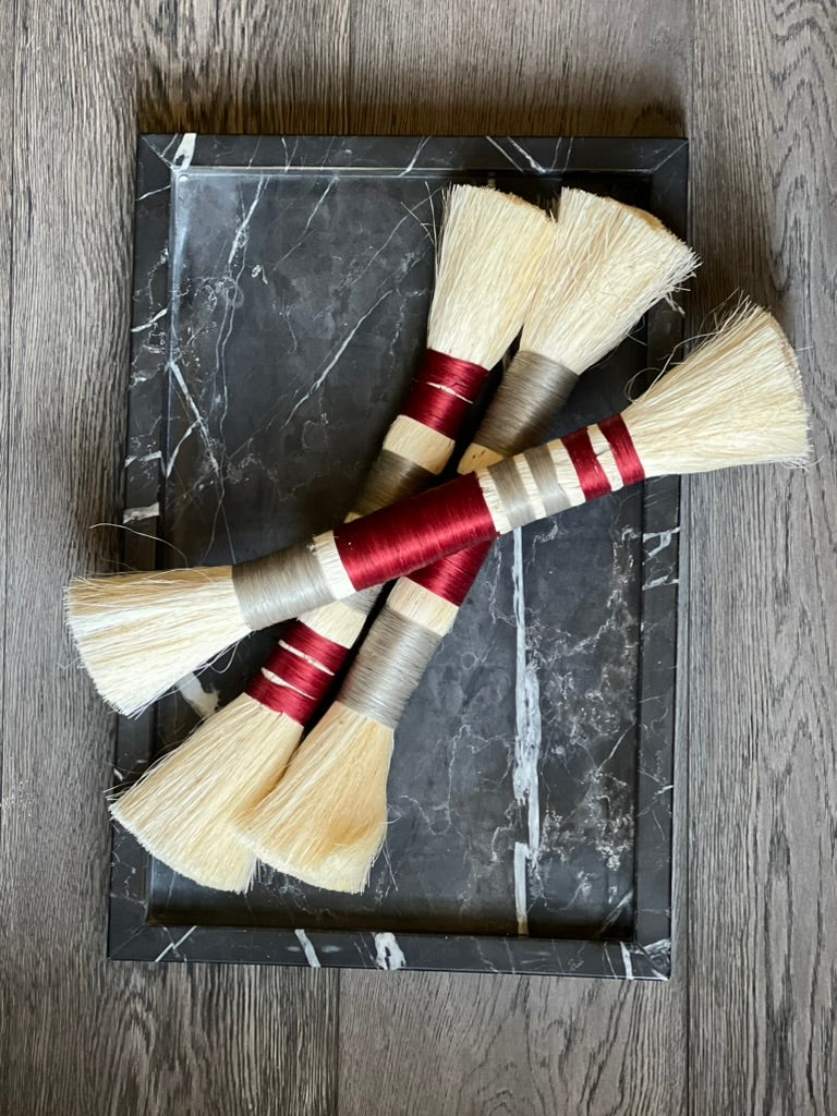 Set de 3 diferentes pinceles de henequén teñido de diferentes colores, hechos en México por artesanas en Yucatán.